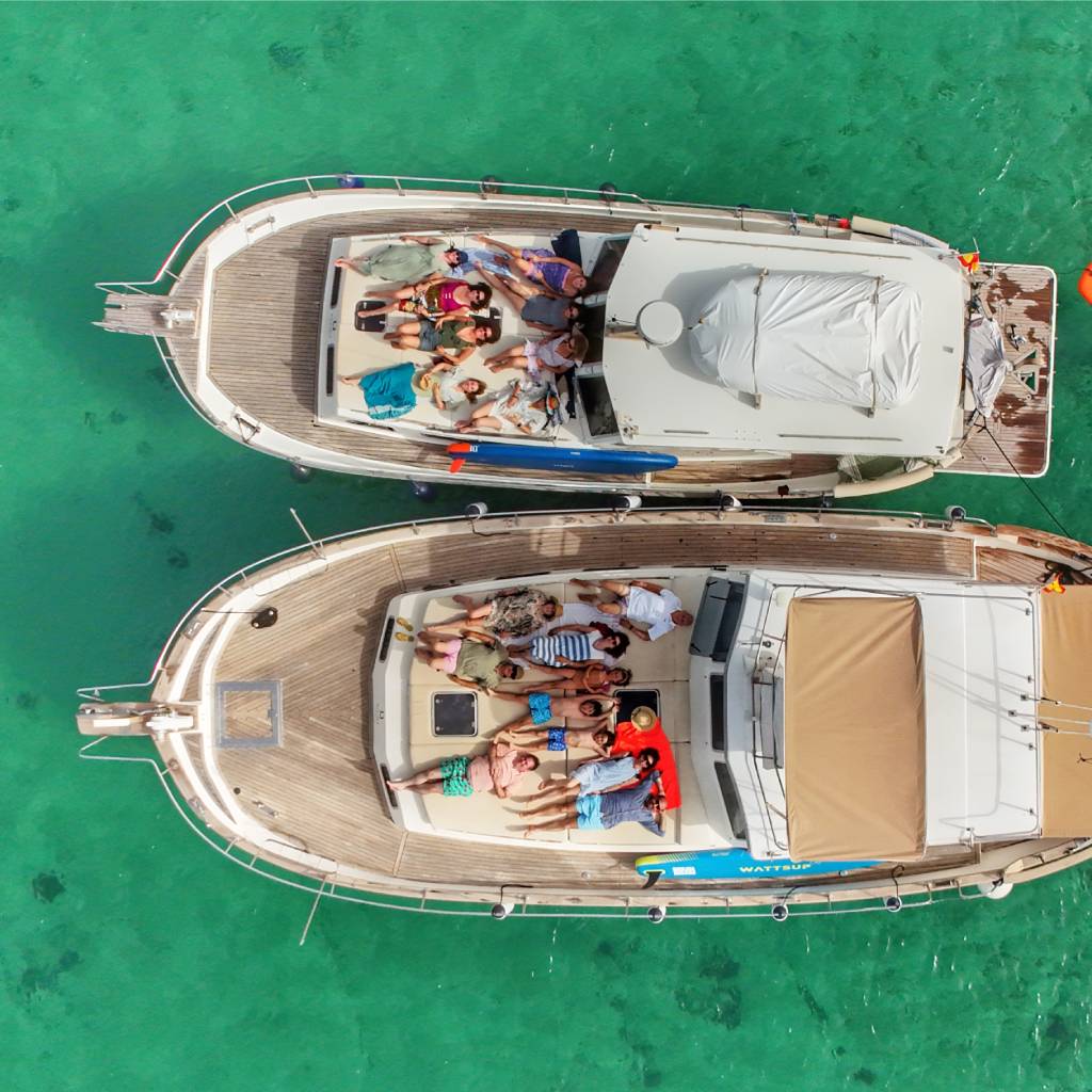 Cada barco está homologado para un máximo de 12 personas, ideal para excursiones privadas en barco por Menorca con total comodidad y estabilidad. Son perfectos tanto para una salida romántica en pareja, como para planes en familia o con amigos, así como para grandes celebraciones como despedidas de soltero o soltera, cumpleaños, pedidas de mano o bodas a bordo.